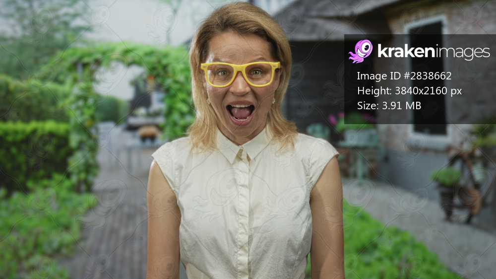 Woman wearing white shirt and yellow glasses smiles with open mouth at building entrance; happiness.
