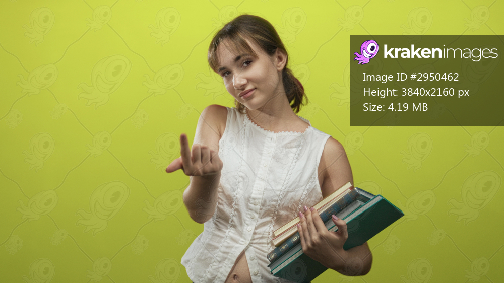 Woman wearing white sleeveless top holding stack of books and beckoning with open hand in lime green studio; confidence learning.