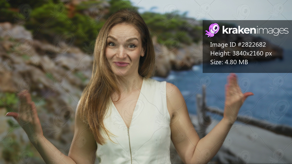 Woman wearing white sleeveless top holds palms out by wooden railing at forest path overlooking rocky coastline; serenity.