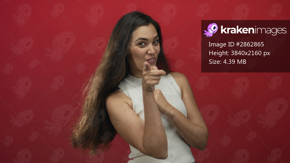 Woman wearing white sleeveless top smiling and pointing index finger toward camera in studio with red wall; confidence.