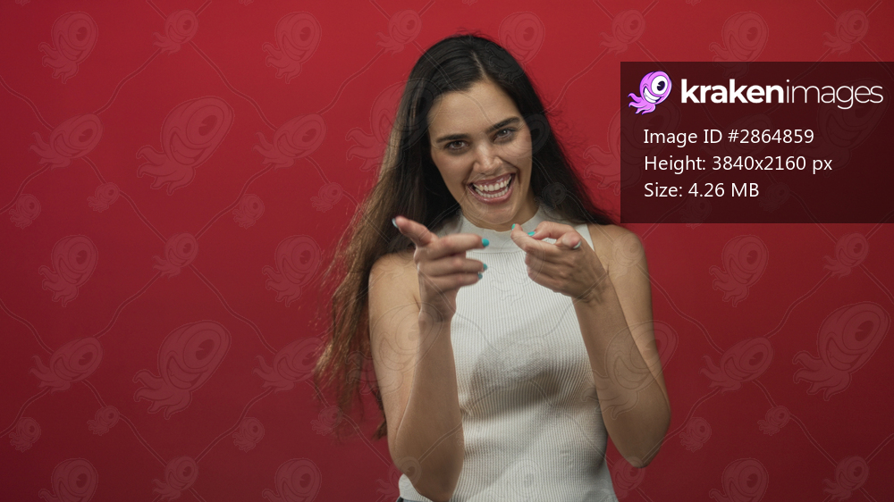 Woman wearing white sleeveless top smiling and pointing index finger toward camera in studio with red wall; confidence.