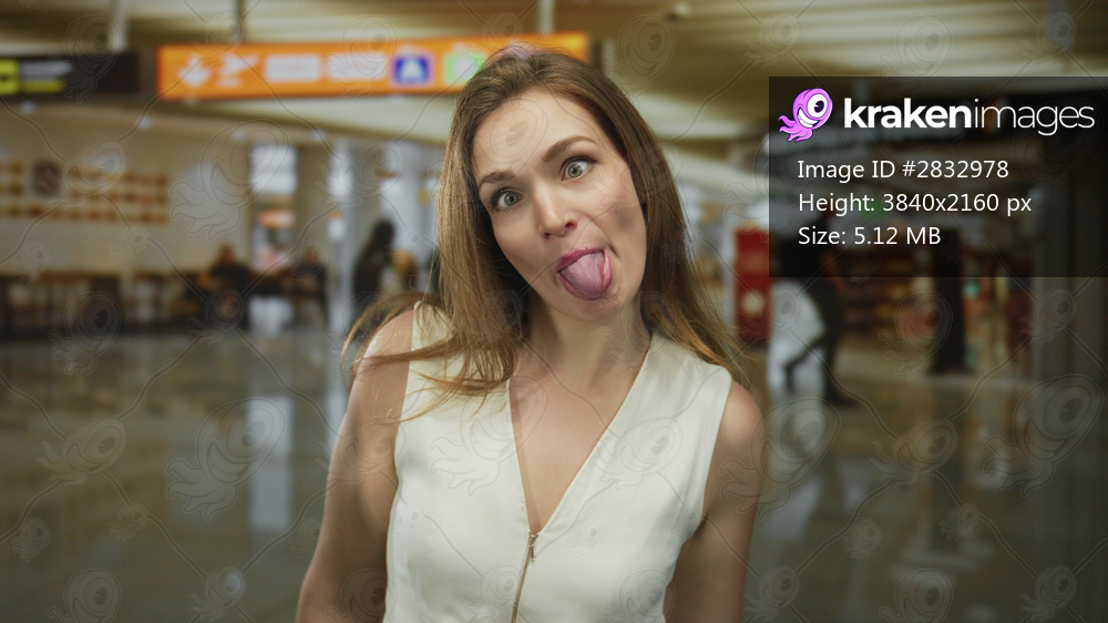 Woman wearing white sleeveless top sticks out tongue in a bustling airport terminal at boarding gate with expressive gesture; playfulness.