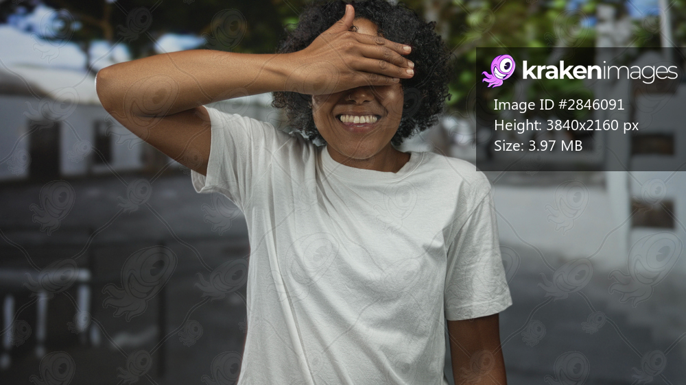 Woman wearing white t shirt covers eyes with hand while smiling on building lined street; playful joy.