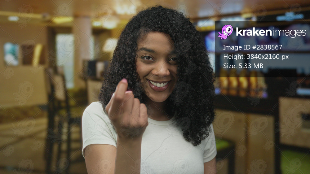 Woman wearing white t shirt makes pinched fingers gesture in restaurant with wooden chairs; warmth invitation.