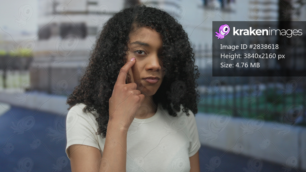 Woman wearing white t-shirt points finger directly at camera on city street; assertive confident stance.