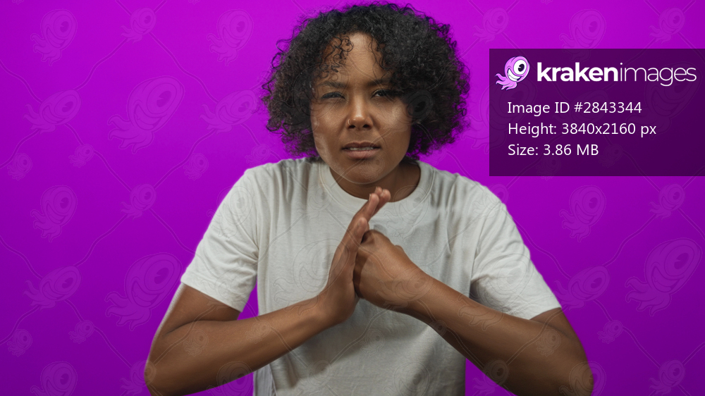 Woman wearing white t shirt punches with fists against magenta studio wall; determination strength empowerment focus.