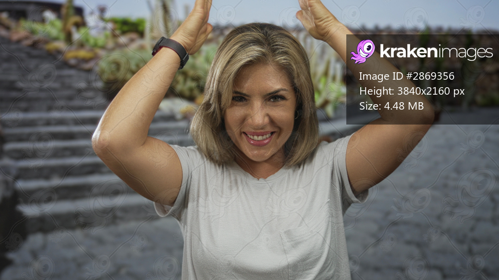 Woman wearing white t shirt raising both hands by head on cobblestone street under bright sunlight; playful joy.