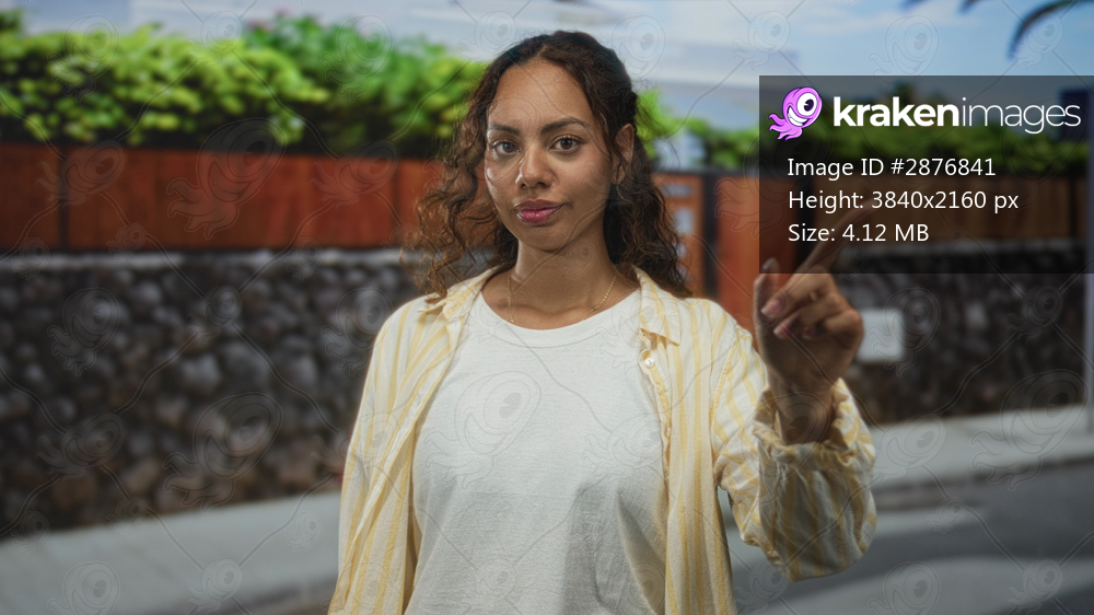 Woman wearing white t shirt and yellow striped shirt points finger at camera on a residential street by a house entrance;assertion confidence.