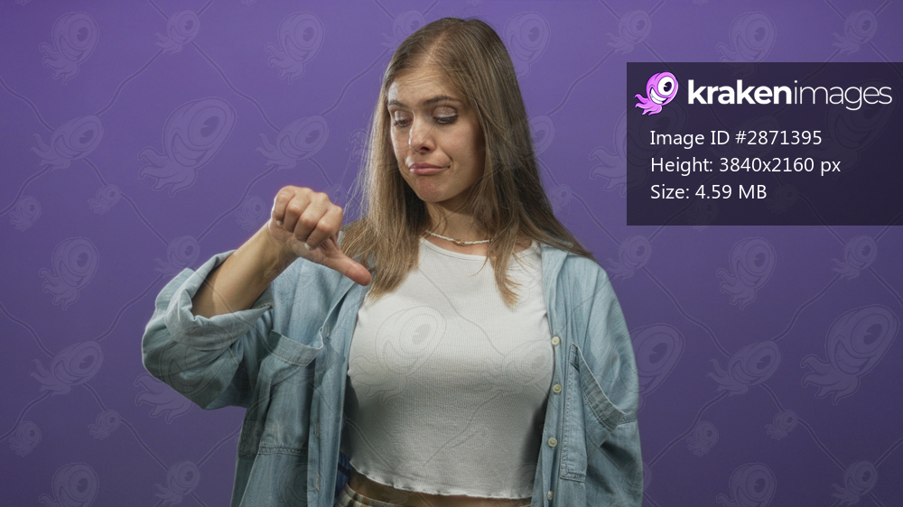 Woman wearing white tank top and denim shirt makes thumb down gesture while facing purple studio backdrop; disapproval.