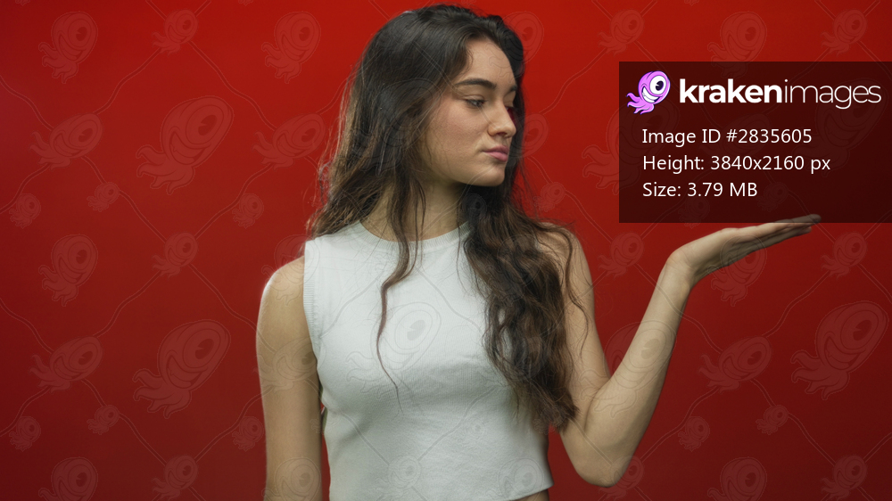 Woman wearing white tank top holds open palm in studio with red backdrop, makes a shrug gesture; uncertainty choice.