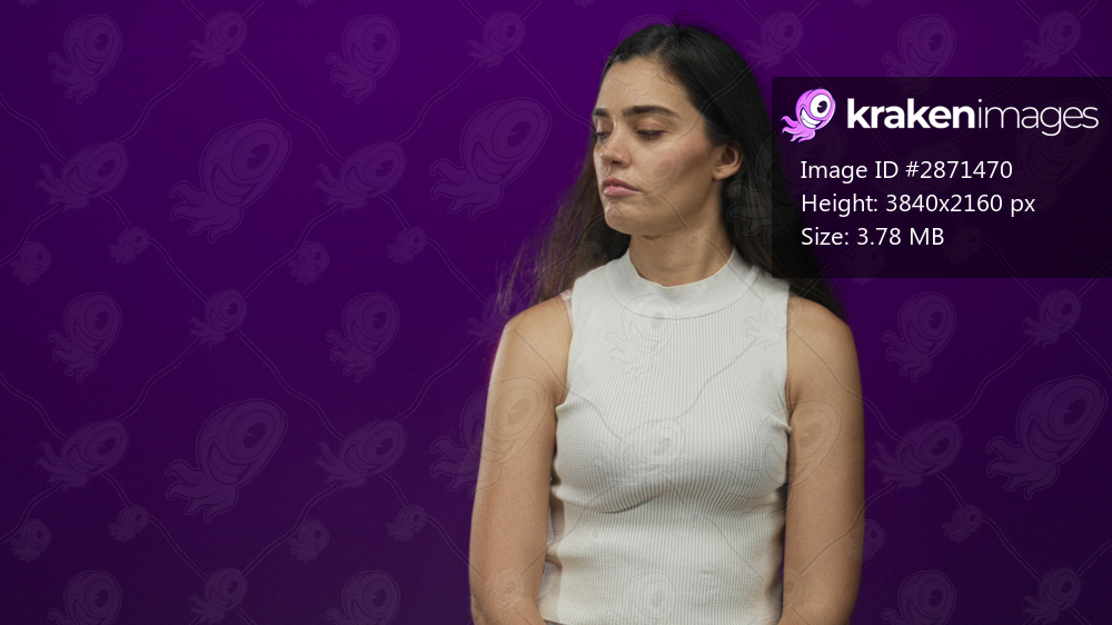 Woman wearing white tank top with long dark hair and bare arms gazing to the side in purple studio; contemplation.