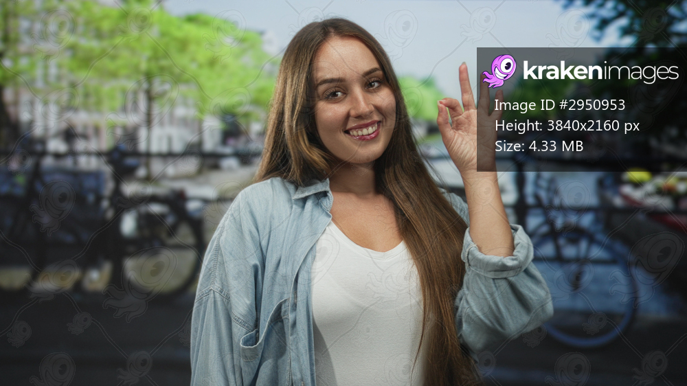 Woman wearing white tank top smiles and makes ok sign on a canal bridge street in amsterdam; confidence travel optimism.