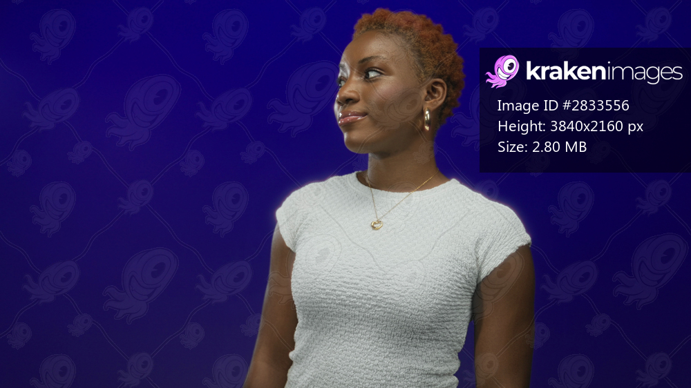 Woman wearing white top and gold earrings turning head to side showing face in blue studio; serenity confidence tranquility calm.
