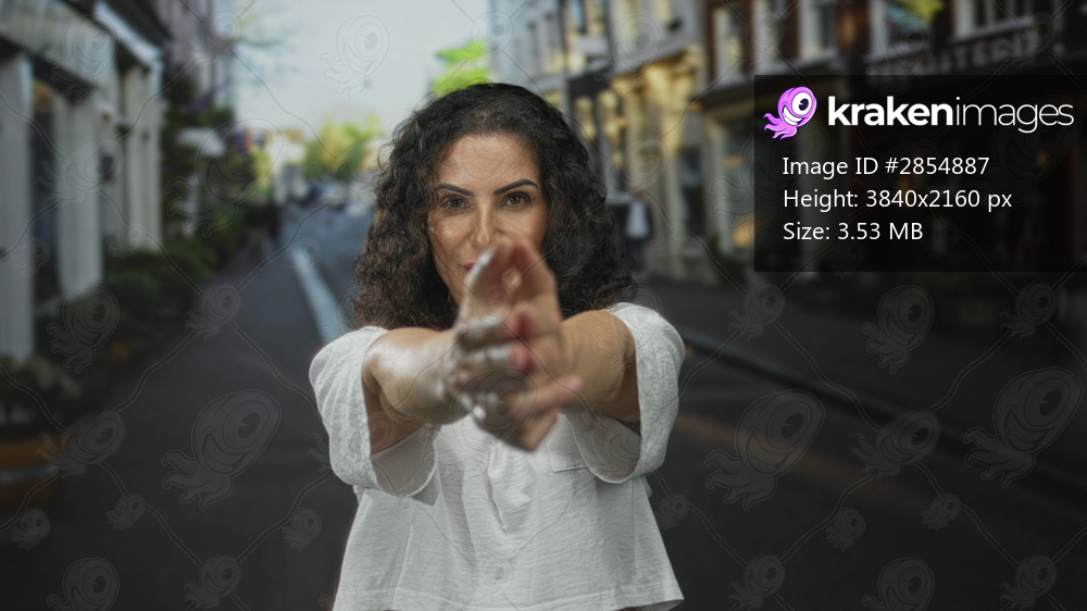 Woman wearing white top makes gun gesture with hands pointing to camera on a downtown urban street; confidence.