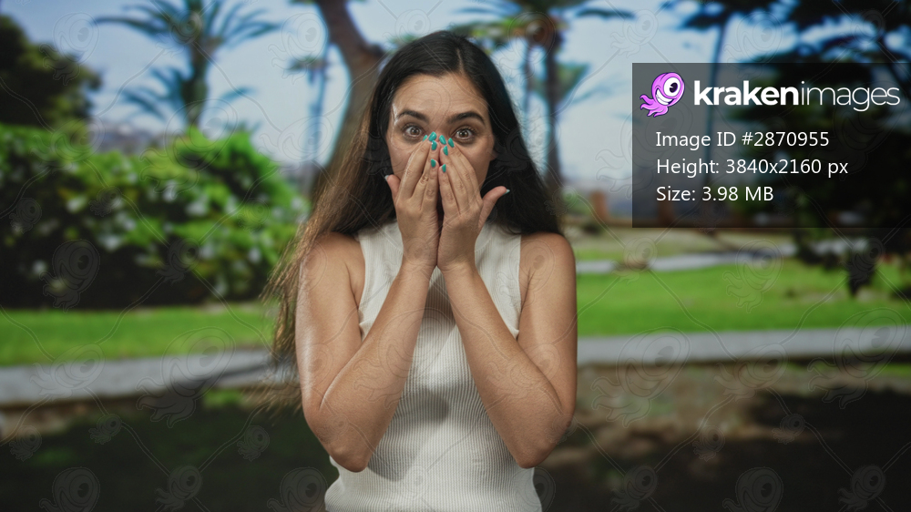 Woman wearing white top shows surprised expression while covering mouth with hands and pointing finger in forest; surprise.