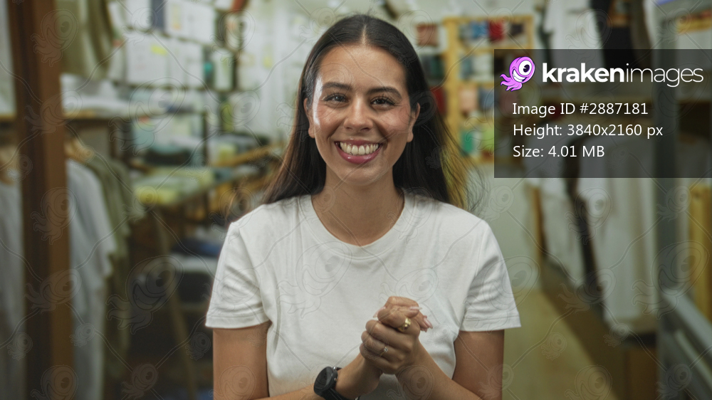 Woman wearing white tshirt smiles, touches hair and clasps hands inside a retail building among shirts and racks; carefree joy.