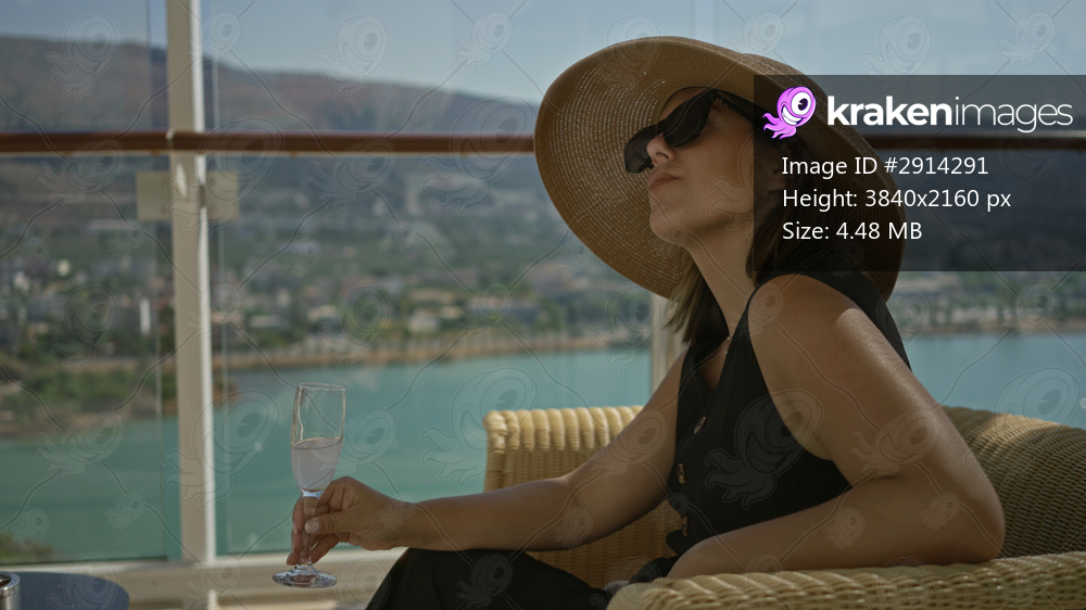 Woman wearing wide brim straw hat and sunglasses, seated in wicker chair sipping from wineglass on cruise terrace by glass railing building with sea view; vacation relaxation. - Kraken Images