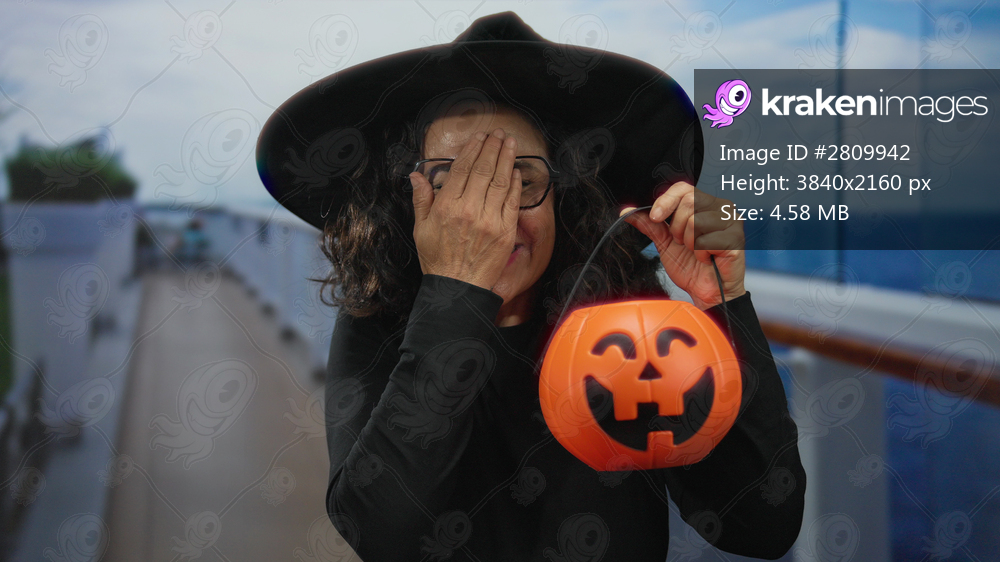 Woman wearing witch hat covers face with hand while holding pumpkin basket on boat deck; joy surprise festivity celebration.