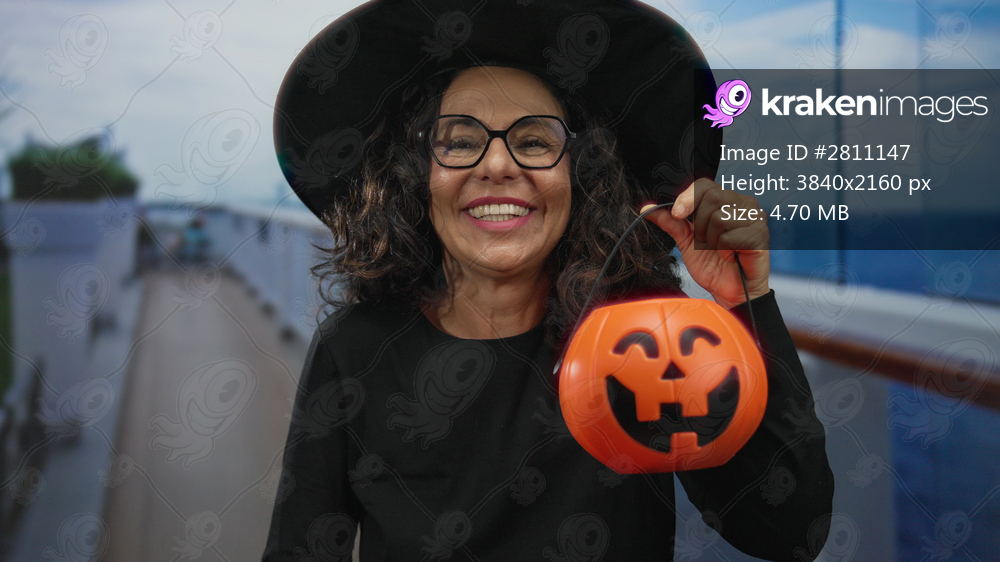 Woman wearing witch hat covers face with hand while holding pumpkin basket on boat deck; joy surprise festivity celebration.