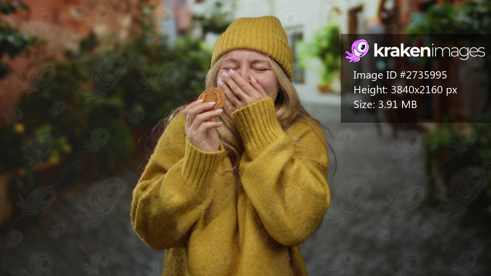 Woman wearing yellow beanie and sweater laughing outdoors on a city street holding a cookie in hand while enjoying a cheerful moment.