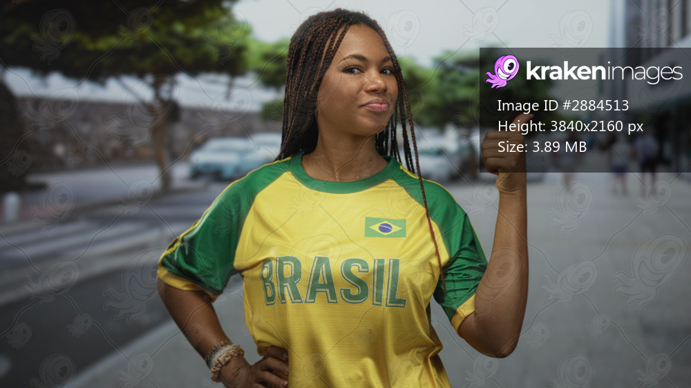 Woman wearing yellow brasil jersey and braided hair smiling, shows thumbs up on busy city street with parked cars, hand on hip; pride support.