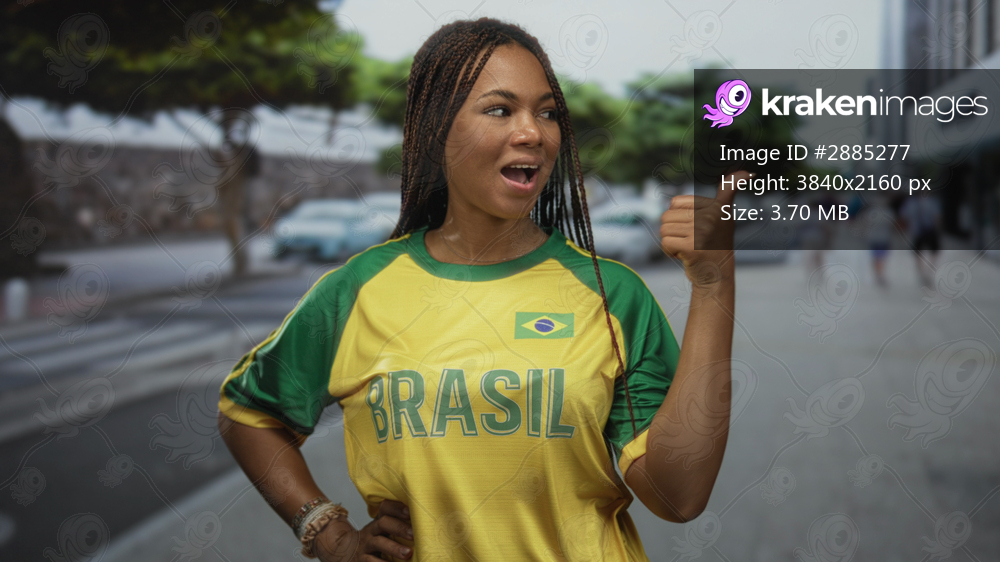 Woman wearing yellow brasil jersey and braided hair smiling, shows thumbs up on busy city street with parked cars, hand on hip; pride support.
