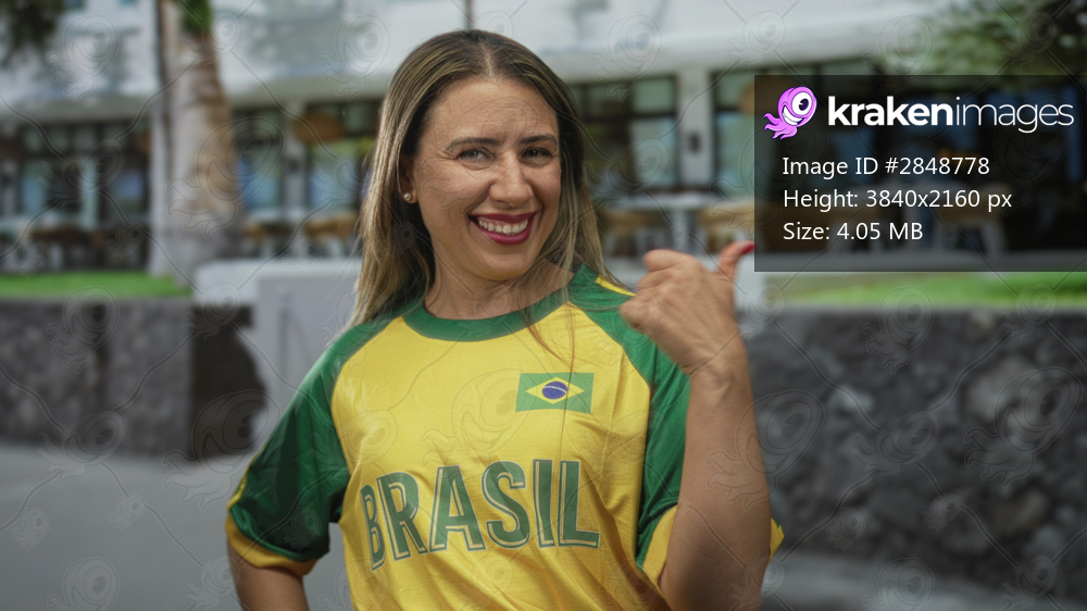 Woman wearing yellow brazil jersey and smiling while giving thumbs up on restaurant terrace inside building; team support excitement.