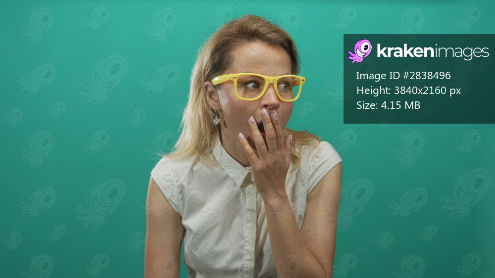 Woman wearing yellow eyeglasses and white blouse raises her hand to mouth while yawning in a teal studio; fatigue.