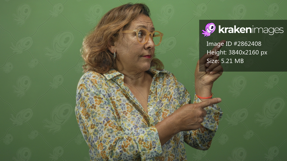 Woman wearing yellow glasses and a floral blouse points finger beside her against a green studio wall; curiosity.