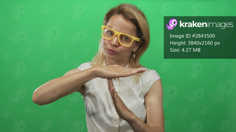 Woman wearing yellow glasses forms timeout sign with hands in a green studio setting with serious expression; calm pause.