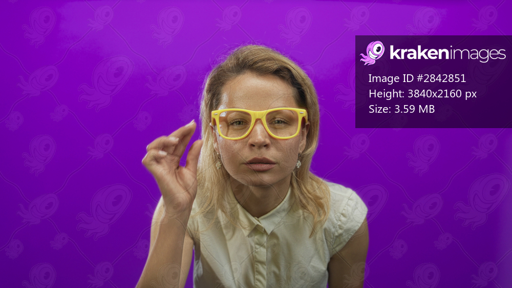 Woman wearing yellow glasses leans forward and adjusts glasses in purple studio setting; serious focus.