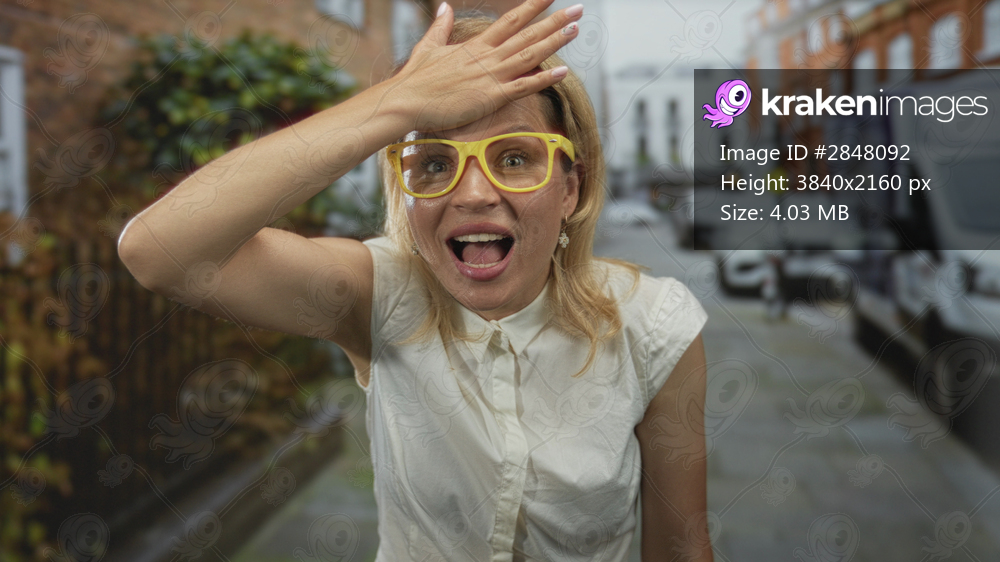 Woman wearing yellow glasses and raising her hand to her forehead on a street with parked vans and brick buildings; relief resilience recovery.