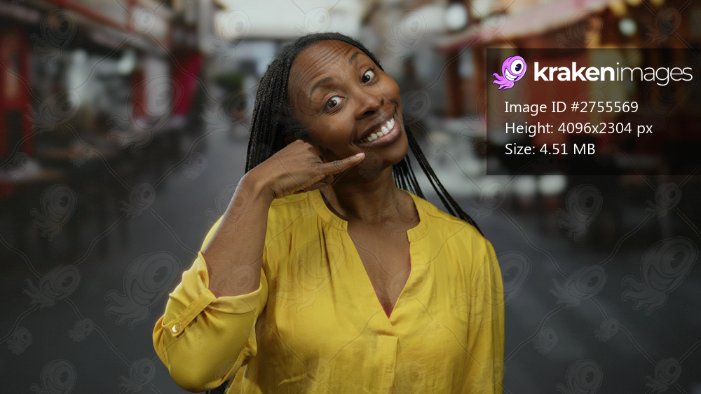Woman wearing yellow shirt gesturing phone call while smiling in an urban street setting, emphasizing happiness and connection.