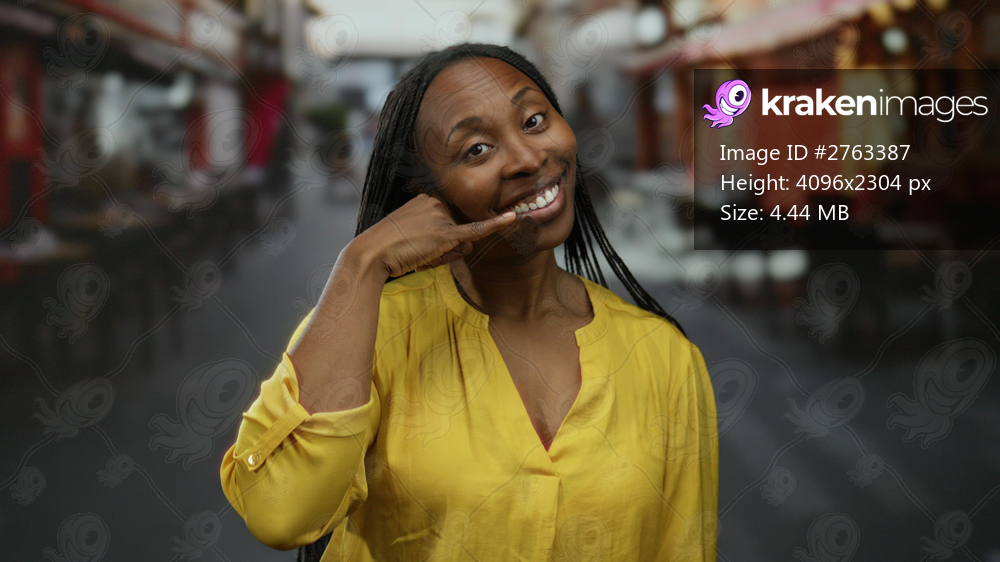 Woman wearing yellow shirt gesturing phone call while smiling in an urban street setting, emphasizing happiness and connection.