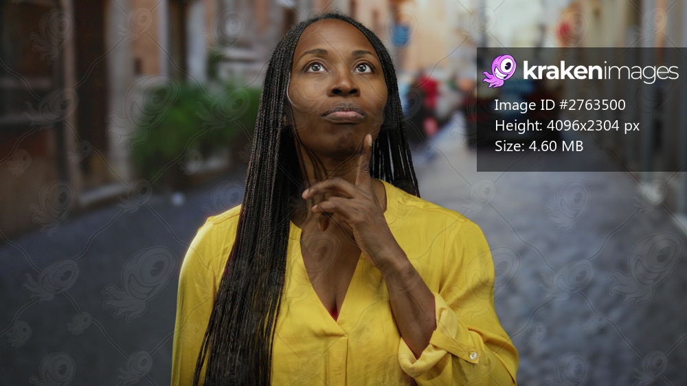 Woman wearing yellow shirt pondering with finger on chin on an urban city street.