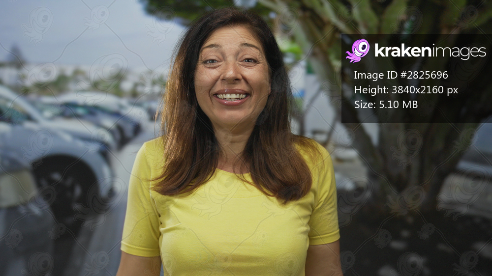 Woman wearing yellow shirt smiling showing teeth on sunlit street next to parked cars and trees; joy.