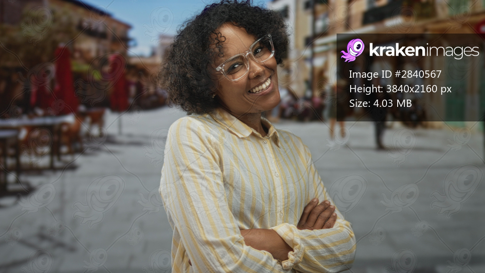 Woman wearing yellow striped shirt and clear glasses with arms crossed on street under sunlight; rejection.