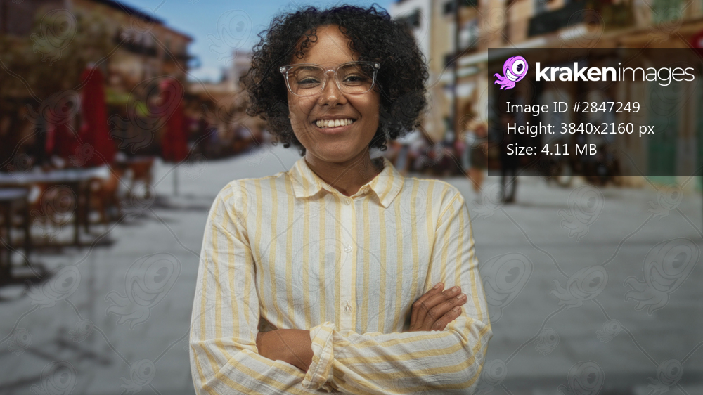 Woman wearing yellow striped shirt and clear glasses with arms crossed on street under sunlight; rejection.