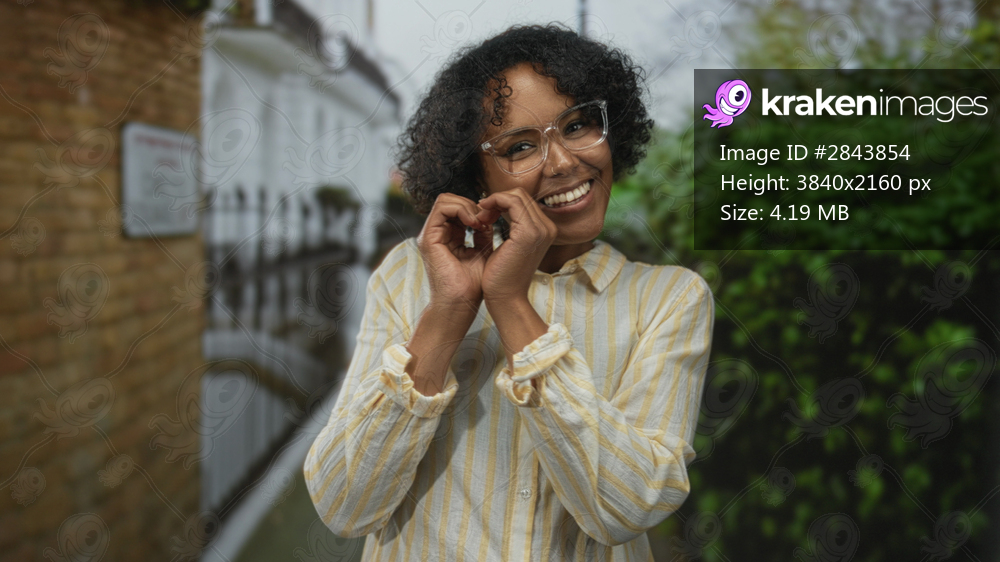 Woman wearing yellow striped shirt forms heart shape with hands on a leafy city street lined by brick wall and iron railings; love.