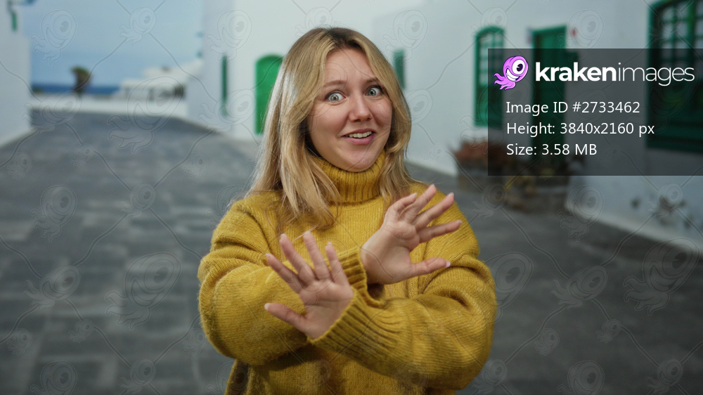 Woman wearing yellow sweater gestures on city street with white buildings and green doors, giving an expressive look in lively outdoor setting.