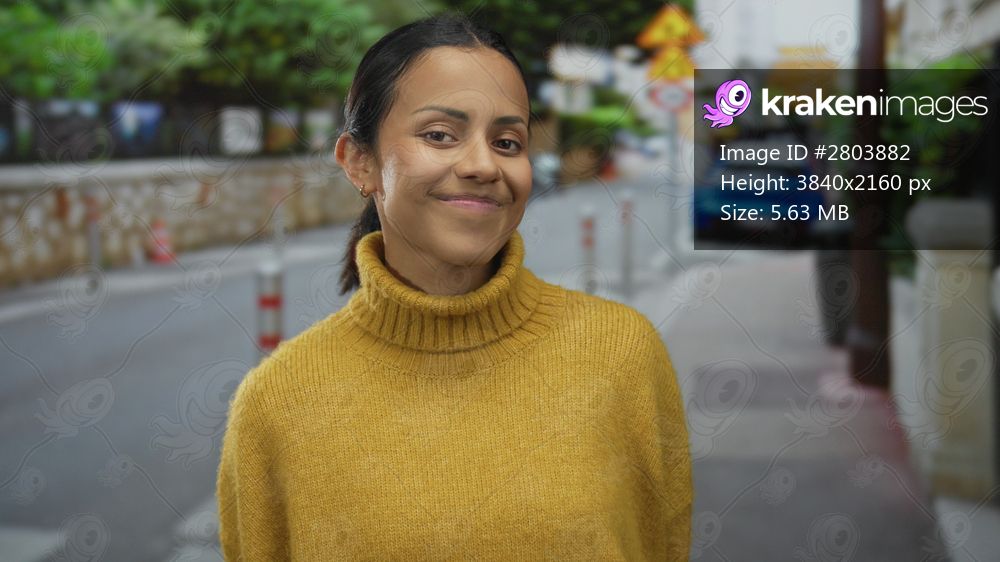 Woman wearing yellow sweater smiles warmly on a quiet street, with blurred city background and green foliage, embodying casual urban outdoor ambiance and hispanic heritage. - Kraken Images