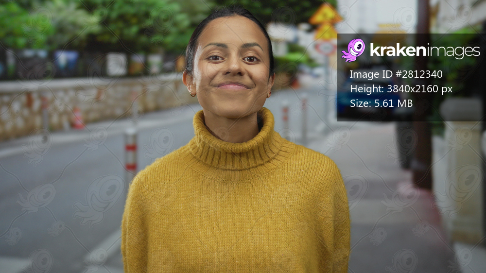 Woman wearing yellow sweater smiles warmly on a quiet street, with blurred city background and green foliage, embodying casual urban outdoor ambiance and hispanic heritage. - Kraken Images