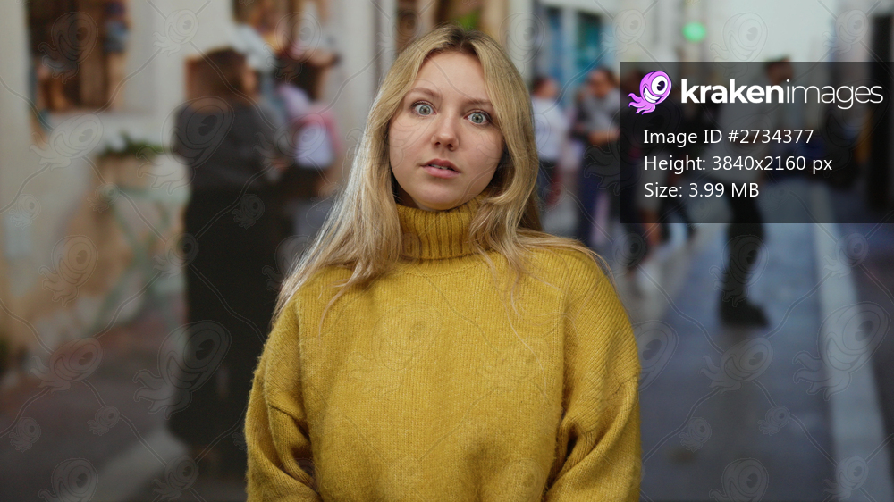Woman wearing yellow sweater standing on busy city street with people walking in the background during daytime.
