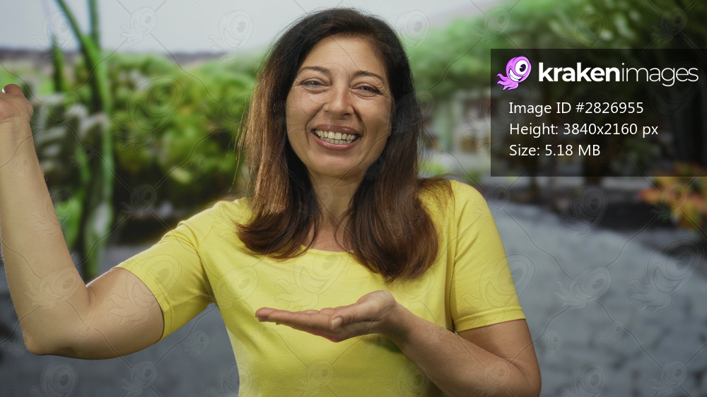 Woman wearing yellow t shirt shows open palm gesture facing camera in a lush green park amid trees and winding path; serenity welcome.