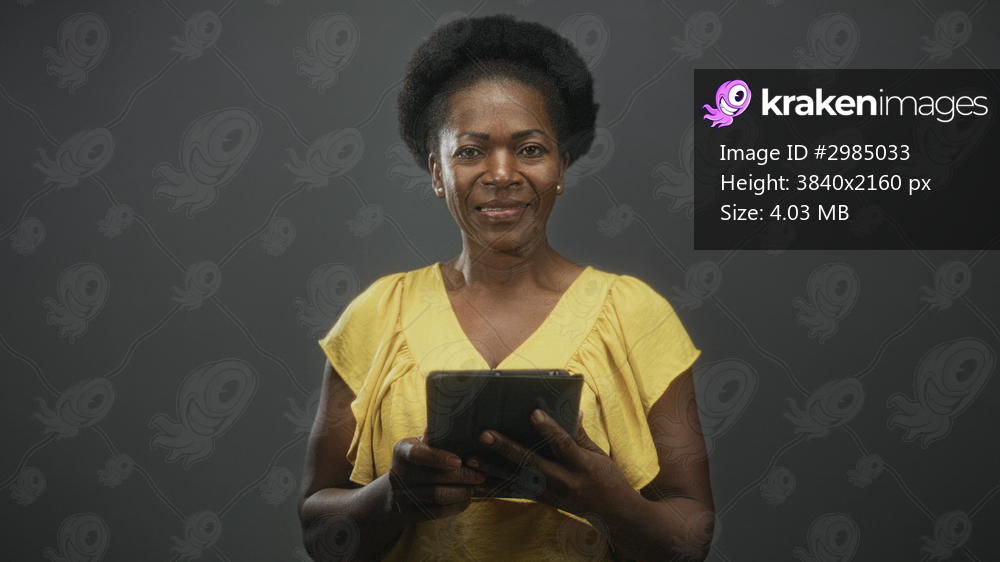Woman wearing yellow top holding tablet with hands tapping screen and soft smile in studio; concentration.