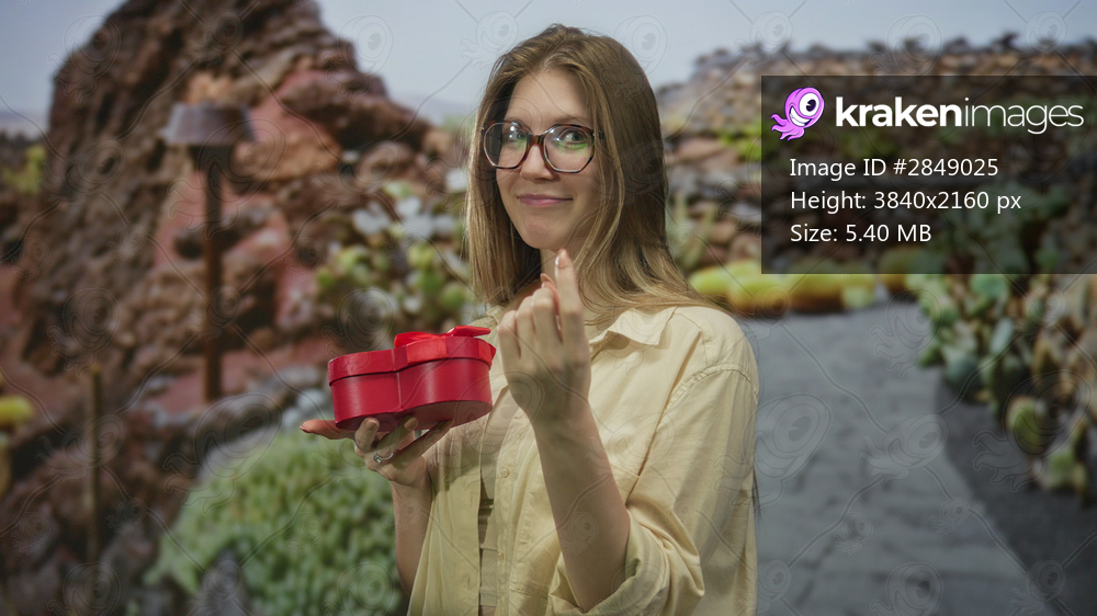 Woman wears glasses and holds red heart gift box while smiling and pointing finger in street; invitation joy.