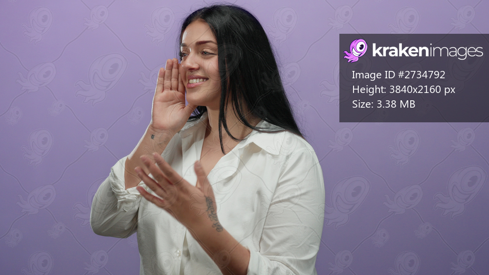 Woman whispering with hand near mouth against a purple background in a studio setting, wearing white shirt, showcasing plus, size, curvy, style, fashion, isolated, smiling, confident. - Kraken Images
