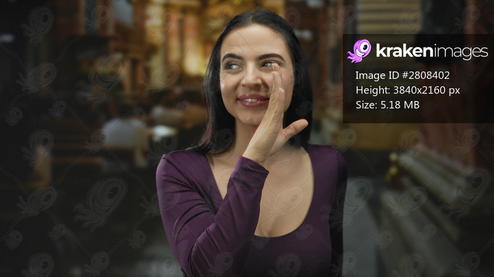Woman whispering in a church setting with an expressive face, capturing a joyful and lively moment inside the ornate interior with blurred congregation in the background. - Kraken Images