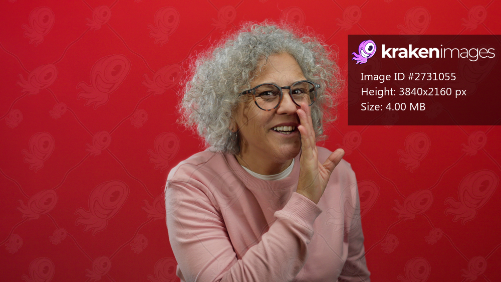Woman whispering in a playful manner on a solid red background wearing a pink sweater and glasses, highlighting her curly grey hair and joyful expression. - Kraken Images