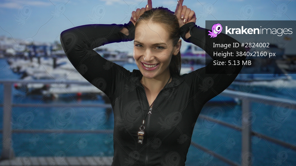 Woman with whistle holds index fingers behind head at seaside pier overlooking moored boats; playfulness.